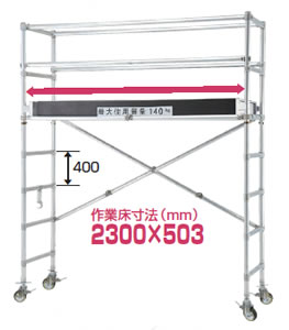 | ■特長 ●作業床は40cm~200cmまで作業に応じて40cm間隔で高さをかえることができます ●パイプ径φ50mm ■寸法 ※下記組立完成画像はオプションの手すり付です。 ![]() ![]() ![]() ■仕様