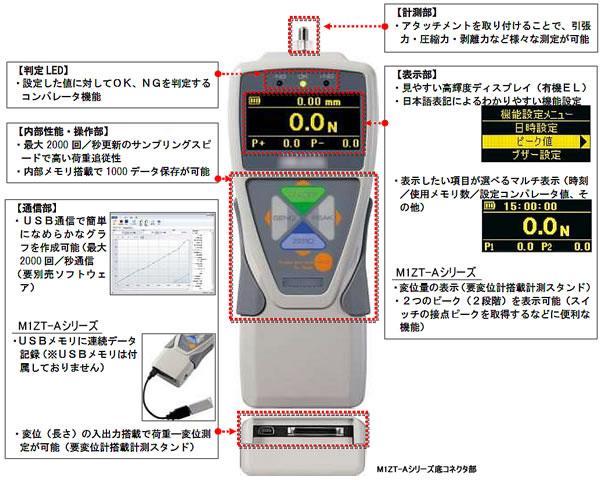 | ■特長 ●最大5000Nまで対応の高荷重型デジタルフォースゲージ ●最大2000回/秒の高い追従性で荷重値をより正確にキャッチ ●有機ELパネルで明るく読みやすいディスプレイ ●日本語によるメニュー表示や、表示したい項目が選べるマルチなディスプレイなど高い操作性 ●USBメモリへの連続データ記録可能(M1ZT-Aシリーズ機能) ●変位計付きの計測スタンドと組み合わせることで、変位量を表示・出力することが可能(ZTA機能) ●2つのピーク値を取得可能(M1ZT-Aシリーズ機能) ■各部説明 ※実際の商品とは形状・デザインが違います。下記画像をクリックすると拡大します。 ![]() ■使用例
