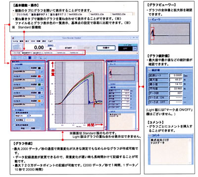 高い追従性で荷重値をより正確にとらえます 日本語表記で、多彩な機能を簡単にセットアップ USBメモリへの連続データ記録や変位(長さ)の入力など新たな入出力機能 |