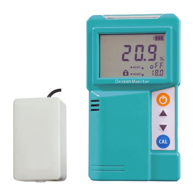 | ■特長 ●酸素濃度0~100vol%のフルレンジで利用でき、高濃度酸素測定が可能です。 ●大型LCDでリアルタイムの酸素濃度が確認できます。 ●コンパクトで持ちやすい形状。オプションに、ソフトケースがあります。 ●2段で警報濃度設定が可能です。それぞれ、上限/下限も選択できます。 ●警報時、識別しやすい電子ブザー音です。 ●2個の赤色LEDで警報を知らせます。 ●警報保持、あるいは自動復帰を選択できます。 ●外部警報出力を用い、回転灯や電磁弁など、制御が可能です。 ●アナログ出力0~1Vを用いて、酸素濃度を外部に取り出せます。 ●長寿命酸素センサーを搭載 大気中平均寿命3年の長寿命酸素センサーを搭載。優れた信頼性で、長く安定して使用できます。 測定レンジは酸素0-100vol%を達成し、高濃度酸素の検知も行うことができます。 ※酸素センサーの寿命は使用環境により変動します。センサー寿命を保証するものではありません。 ●単三アルカリ乾電池で連続1年間の駆動が可能 駆動時間は連続1年間(無警報・アナログ出力未使用時)を達成。外部電源が取れない場所や、緊急時の停電時も安心して使用することができます。 また、電池駆動により、携帯型として使用できるため、屋外での酸素検知が可能です。 ●強力な警報システム AL1、AL2の二段階警報、警報ブザー、高輝度LED警報ランプ、警報出力(リレー無電圧接点)、アナログ出力0-1Vが実装されており、万が一の酸欠警報の際に周囲に確実に危険を知らせます。 ●停電補償モード/エコアラームモード <停電補償モード> 外部電源にて当商品を駆動させている際に、停電により電力供給が遮断された場合、自動的に搭載されている単三アルカリ乾電池駆動に切り替わり濃度監視を継続します。 <エコアラームモード> 単三アルカリ乾電池駆動時に警報が鳴りっぱなしになり、電池寿命に達すると、必要最低限の警報表示以外の機能は停止させます。警報ランプを点滅させ、液晶画面には最後に警報がなった警報段階(AL1またはAL2)を表示させることで、最後まで周囲に危険を知らせ、作業員の安全を守ります。 ■タイプ お客様の使用環境に最適な1台を選べます。