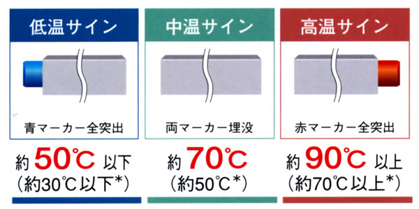| ■温度異常が一目瞭然 設備の温度異常をサインでお知らせ ●取付対象物の温度異常を目に見える形で表示。 ●温度状態を示すマーカーには着色が施してあるため、より直感的な判断が可能。 ![]() *( )は対象物の表面温度です。 マーカーの動作は対象物の表面温度を感知しており、赤字で示す内部温度は目安です。 ■機能を備えたフォルム さまざまな形状に対応 ●対象物の形状に合わせて3タイプの取付面を用意。 専用の取付テープとセットでより確実な温度感知を実現。