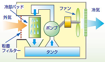 スポットクーラーと比べ、わずか15%の消費電力で冷却 噴出し口温度が室外で約10℃、室内で約5℃下がります。 (雨天など下がりにくい場合もあります。) |