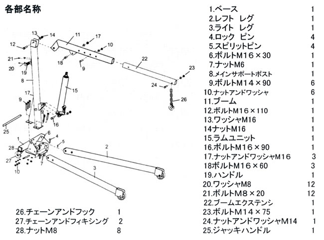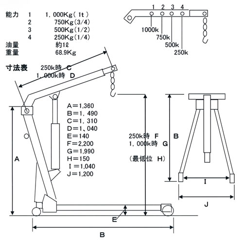 本機は、簡易油圧クレーンとして、自動車のエンジン脱着等重量物の吊り上げ移動作業やクレーン設備の無い作業現場での機械の積み下し作業を合理的に行う事が出来ます。 又、車輪アームを畳むことにより、小さなスペースで保管することが出来、出張用として持ち運ぶ事も出来ます。 最大能力:1t 吊上げ高さ:25mm~2,000mm 寸法:W1,100mm×D1,520mm×H1,500mm 重量:68.9kg |