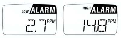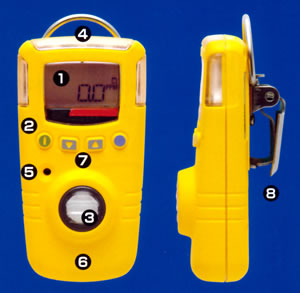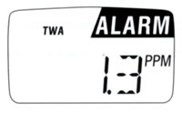 | ■特長 ●3種類の警報機能搭載(下記参照) ●ピーク値メモリ機能搭載 ●センサー寿命2年(※1) ●データロガー機能搭載(※2) ※1:寿命は使用環境により変動しますので2年を保証するおのではありません。 ※2:データロガー機能により収集したデータを外部(パソコン等)に読み込むにはオプションのIRデータリンクが必要です。 ■2段階リアルタイム警報 本機周辺のEOG濃度が任意に設定された数値に達すると警報を発します。 警報値の設定は1段階(LOW)と2段階(HIGH)の2点が設定することが可能で、 リアルタイムの測定値がLOW設定値に達すると警報を発し、さらに設定値が高くなり、 HIGH設定に達すると強い警報を発します。 初期設定はLOW=1ppm、HIGH=5ppmになっています。 (1段階目の警報の場合は測定値ともに「LOW」という文字、2段階目の警報の場合は「HIGH」という文字が点滅表示されます) ![]() ■TWA警報 TWA(Time Weighted Average)とは時間加重平均許容濃度のことで、1日8時間、 週40時間の労働時間中にほとんど全ての労働者が毎日繰り返し暴露を受けても健康障害を起こさない濃度です。 初期設定は「1ppm」になっており、時間加重平均濃度が1ppmを超えると警報を発します。 (TWAけいほうの時には測定値とともに「TWA」という文字が点滅表示されます) ![]() ■STEL警報 STEL(Short Term Exposure Limit)とは短時間暴露限界のことで 1日のうちのどの15分間の時間平均加重も超えてはならない濃度です。 初期設定は「5ppm」になっており、直近15分間の平均濃度が5ppmを超えると警報を発します。 (STEL警報の時には測定値とともに「STEL」という文字が点滅表示します。) ![]() ■各部の名称