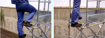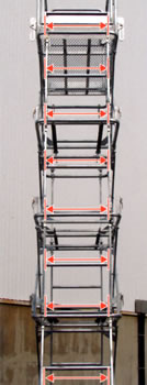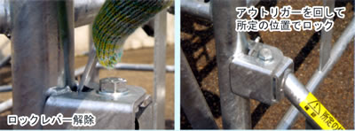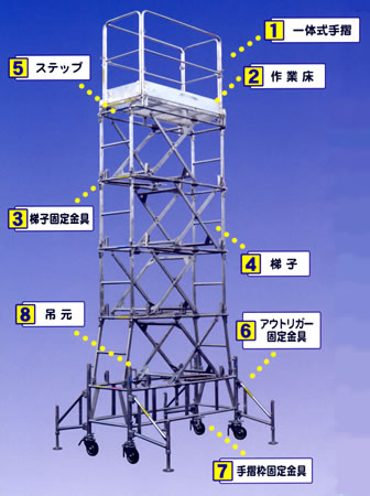 ■安全のための9の特長![]() ①本体一体型手摺 簡単に折りたたみができ、運搬や組立がとても楽で、強度も有り安全です。 着脱式の手摺やつま先板と違い、部材の滅失がありません。 ![]() ②安全設計作業床(転落防止・落下防止) ・人の墜落防止として 手摺 高さ900mm 中さん 高さ450mm ![]() ・物の落下防止として 幅木(つま先板) 高さ150mm 作業床上の隙間10mm以下 ![]() ③梯子固定金具(フックが可動式で強度アップ) フックを可動式にしたことで固定強度が向上し、より安全性が増しました。 ![]() 黄色のパッチン錠はオプションです。 ④ストレートな梯子(危険な要因は排除) 足を掛ける場所が、どの段も一定の幅なので足を踏み外す危険が減り、 安全に昇り降りができます。 ![]() ⑤作業床下部にステップ(安心感があります) このステップに足をかけることで作業床の昇り降りが、とても楽で安全にできます。 ![]() ⑥アウトリガー固定金具とジャッキレバー(安全な位置でしっかり固定)