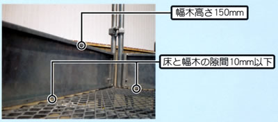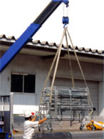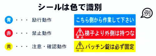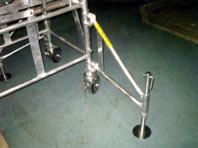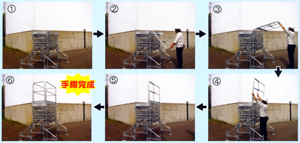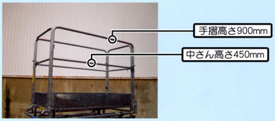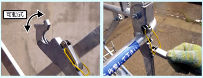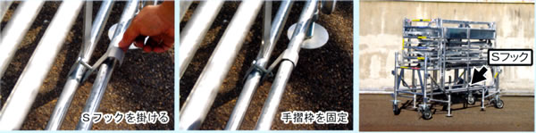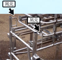 ⑦手摺枠固定金具Sフック(バタつき帽子で安全に運搬) 手摺枠を折りたたんだ際、バタつきを防止するためにS字型のフックを設けました。 フック金具を手摺枠に掛けて固定するだけで、破損防止と安全な運搬ができます。 ![]() ⑧4ヶ所の吊元(便利で安全) 4点吊用の吊元で安全に吊り上げができます。 移動や搬入等に便利です。 ![]() ⑨識別シール(安全にご使用いただくために) シールの通り行うと、組立てや作業等が、スムーズに、安全に行うことができます。 ![]() ![]() ■仕様