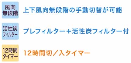 ■ノンドレン機構(冷風・ドライ時) 冷風時は排気と一緒にドレン水を排出します。 ※温風時はドレン水を背の低い受皿やホース(市販)排水などで処理する必要があります。 ■抗菌フィルター 吸い込み口に抗菌フィルターを設置し、清潔に保ちます。 ■着脱式リモコン ![]() ![]() ■RoHS指令 家電製品などに、特定の有害物質を使うことを禁じる規制です。 廃棄されたあとに環境を汚染したり、人々の健康を損なう恐れのある物質を製品および製造工程から排除することを狙いとしており、環境への関心がひときわ高い欧州連合(EU)で2006年7月1日に施工。 特定有害物制限の国際スタンダードとされています。 規制の対象となる物質は、鉛、カドミウム、6価クロム、水銀、PBB(ポリ臭化ビフェニル)、PBDF(ポリ臭化ジフェニルエーテル)の六種類です。 ![]() ■運転モード ![]() ■仕様