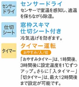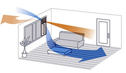| ■吹き出しセンサー ●温度のムラなく冷気あ部屋中に行きわたります。 ●窓の左右どちらに付けてもOK ■吹き出し位置の違いによる温度分布比較(当社比) 部屋の冷えが悪くなるショートサーキット現象が起きにくい高効率冷房です。 ※ショートサーキット現象とはルーバーから出た冷気が熱交換機へ直接戻る現象です。 ![]() ![]() ■センター吹き出しなら窓の左右どちらでもOK ![]() ![]() ■人感センサー(M223W-AS180FT、M223W-A180FT、M223W-A160FT) 人の動きをセンサーで感知し、自動で運転を切り替えます。 ![]()