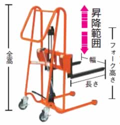 ●最低位が低いのでボックスパレットやスキッドタイプのパレットなどをすくうのに適しています。 ●過負荷防止バルブ付です。 ●後輪自在車輪には、両輪ブレーキ付ゴム車を採用しています。 |