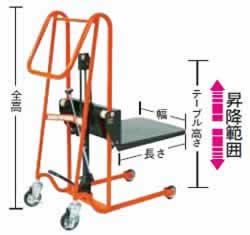 | ■用途 ●荷物の昇降や運搬。 ■仕様 ●手動走行式 ●昇降方式:足踏み油圧式(タービン油:ISO-VG22使用) ●前車輪:固定ゴムキャスター2個、 ●後車輪:自在ストッパー付ゴムキャスター2個 ■製造国 ●日本 ■軽量化されたシンプルフレーム ![]() ■後輪は両輪共にブレーキ付 ![]() ■使用例 ![]() ■寸法図 ![]() ■仕様