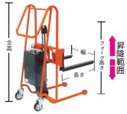 | ■用途 ●荷物の昇降や運搬。 ■仕様 ●手動走行式 ●昇降方式:バッテリーボールねじ式 ●電源:単相100V(コード長さ:2m) ●搭載バッテリー:30A19L ●充電時間:約10時間 ●前車輪:固定ウレタンキャスター2個、 ●後車輪:自在ストッパー付ゴムキャスター2個 ■製造国 ●日本 ■使用例 ![]() ■寸法図 ![]() ■仕様