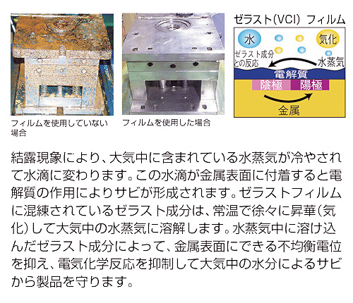 | ■特長 ●粘着性と弾力性を兼ねそろえた特殊フィルムで、粘着面よりゼラスト成分が発散されます。 ●優れた密着性を発揮し、形状・種類の異なる機械の同時梱包が可能です。 ●ロールが小さく軽量のため、一人での扱いが可能です。 ●鉄コイルや一般部品への機械巻も可能です。 ●結露しても錆びないというゼラスト成分の特長ゆえ、輸出品防錆包装に最適です。 ●安全性はフィルムと同じくゼラスト成分には第2アミン類の薬剤は一切使用されておりません。 ※未開封期限:5年 ■用途 ●金型、機械装置、部品の防錆包装。 ●主に輸出、輸送時。 ■仕様