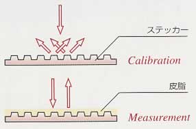 ■水分と皮脂のバランスがとれたしなやかな肌![]() ■「セバムステッカー」の表面には凹凸があり、測定前にステッカーのキャリブレーション時には、光の反射は拡散さ れています。 皮脂がステッカーの表面を覆い表面が滑らか(ほぼ平ら)になると光の拡散が減少し、LED(発光ダイオード)の光はレ シーバーにまっすぐ反射されます。 つまりレシーバーにあたる光量が多いほど、お肌の皮脂が多いということになります。 ![]() ■カウンセリングチャート 測定結果は数値で表示されます。チャート図でお肌のうるおい度を確認します。 ![]() ![]() ■用途 肌の油分/水分測定・カウンセリング ■仕様