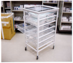 薬剤部での医薬品やカルテの運搬カートとしてお使いいただけます。 中身がひとめで確認できる透明引出しタイプ。 中身が見える透明天板。 |