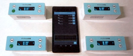 ■オプション ●タブレット タブレット画面のマルチセンサーモニターをタップし、ソフトを起動します。 本体に表示してあるアルファベット・数字 2桁 はブルートゥースモジュールのアドレス下2桁です。画面表示のアドレスを参照してどのセンサーが何CHに接続しているか確認できます。 ![]() ・多点測定 傾斜計4台とタブレットを組み合わせ4ポイントの傾斜を同時測定。 傾斜計は最大7台まで組み合わせ可能。 ![]()