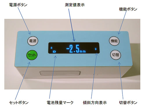| ■特徴 ●分解能 0.01゜ ●測定範囲 ±15゜ ●ブルートゥース通信機能 ●タブレット画面に測定値一覧とグラフを表示 ●防水機能(底板止め部を除く) ●タブレットとの組み合わせで多点測定が可能 ●電池残量表示 ■各部名称