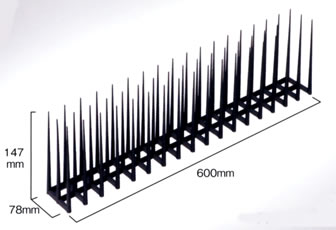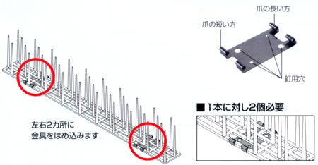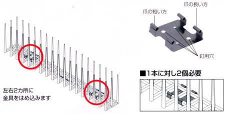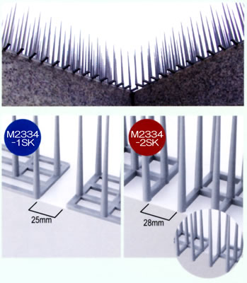 ■取り付け方法 ●奥行きがない場所への取り付け(横方向に並べる場合) ![]() 本体を端いっぱいに合わせ、25〜28mmの間隔で並べて設置してください。 (M2334-2SKの場合は本体の中央部分を端に合わせて使えば鳥が足をかけられず、なお効果的です※円内参照) ※壁面から並べ始める場合は、1つ目を壁面より2〜3mmあけたところから並べてください。 ●奥行が広い場所への取り付け(しきつめる場合) ![]() 12〜28mmの列間隔で2列、3列と並べて使用してください。 ※奥行きが広い場所で、すでに被害のある場合は、必ずしきつめを行って下さい、 ハトは帰巣本能が強い為、少しのすき間でも無理やり止まろうとします。 ■仕様