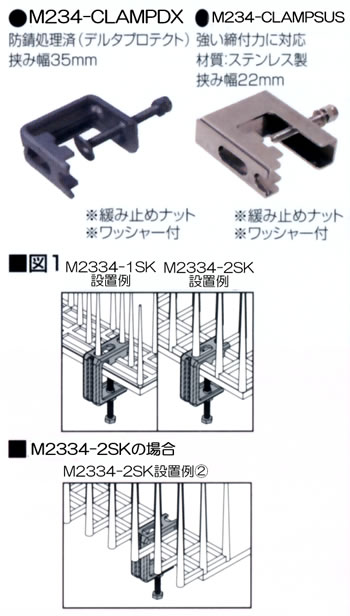 ○鉄骨用クランプ/品番 M234-CLAMPDX・M234-CLAMPSUS(SUS) ![]() @本体に止め具をはめる(2ヵ所)。 クランプ上部の穴を剣山に差し込むと、よりしっかり設置できます。(図1) A手もしくはドライバー等でしっかり締めて固定します。 最後にナットをしっかり締めてください。