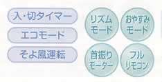 | ■エコモード 運転中、適度に「切」状態を挟んで、電気を節約します。 ![]() ■安全対策 @モーターカバーに燃えにくい素材 Aコンデンサに保護機能 B操作部に防炎処理(メカ式のぞく) ![]() ■切入併用ツインタイマー(リモコン) エアコンと併用して快眠&節電 「切タイマー」と「入タイマー」が併用できるのでエアコンと上手に組み合わせて、快眠&節電 ![]() ■入・切タイマー 1・2・4・6時間設定で快眠&節電 入タイマーでエアコンと扇風機がバトンタッチ。節電と快眠を同時にできる。 ■リズム風モード 自然風のような心地よさを演出します。 ■おやすみモード 徐々に風を弱めます。さらにお目覚め頃に再運転。 ■そよ風運転 弱運転よりもおだやか。風がうるさいと感じる方に最適な心地よさ。 ![]() ■操作部 ![]() ■フルリモコン すべての操作がリモコンで可能 ![]() ■寸法図 ![]() ■仕様
