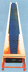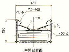 トラフとスカートが一体、搬送物がこぼれ難い。 舟底形/モータプーリ駆動式 |