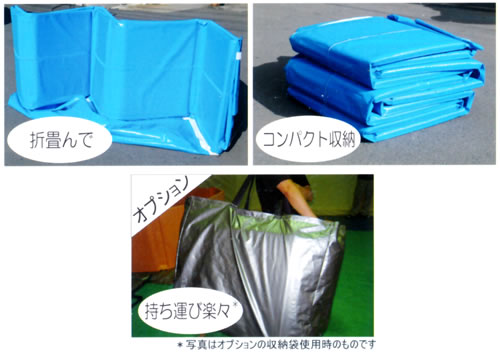 | ■特長 ●自立式水槽 ・水槽に水を入れるだけで自立します ・支柱や枠などを使用しない為、短時間で設営が可能です。 ●工具類が不要 ・設営方法は水槽を広げ、水を入れるだけ。 ・出水時は水槽側面に装備されているホースから水を出すことができます。 ・特殊な技能や工具類を必要としない為、簡易に設営ができます。(給水等の設備を除く) ●コンパクト収納 ・保管時には、折畳むことによりコンパクトな収納が可能です。(10角形タイプ 700mm×1000mm×500mm) ・持ち運び等がスムーズに行えます。 ●用途により2種類の素材から選択できます ・塩化ビニル(PVC)タイプは、耐摩耗性に優れています。 ・エチレン酢酸ビニル共重合体(EVA)タイプは、PVCと比較し軽量で、食品衛生法「厚生省告示第370号」に適合しています。 ![]() ■ふた付タイプ※ 雨、ホコリ、ゴミを防ぐふた付タイプもあります ![]() (!)使用上の注意 ※ハンディブロワー等にてエアーを水槽内部に注入する必要があります。 ※この仕様はPVC素材のタイプのみとなります。 ■用途 ●防災・災害用 ●工業用 ●水産用 ●農業用 ●工事現場用 等における仮設水槽 ■仕様 ●貯留物:水(温度範囲:5~40℃) ●床面形状 ![]()