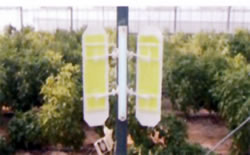 農作物現場での害虫被害を未然に防ぐ! 2枚羽のアームが効果的に捕虫! 捕虫機は農作業現場で邪魔にならず、オシャレに設置できるよう設計されています。 2枚羽のアームを可動させ、カバーを自由な角度に設定できます。 ケミカルランプで誘引し、粘着シートで虫を捕まえるので安全無害です。 |