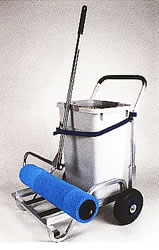 ローラーを転がすだけで即吸水 各種屋外施設、グラウンド、コード等 専用絞りバケツ 押えるだけで即排水 |