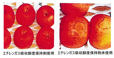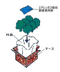 生鮮野菜や果物の鮮度は、貯蔵、流通されている間にも、雰囲気の組成(酸素、二酸化炭素、エチレン等)や濃度、温度、湿度、結露水などの影響を受けています。 M2401MB-4Cシリーズは、青果物からのエチレンガスやアセトアルデヒドガスを除去して青果物の過熱を抑制し、また果肉の軟化防止、水分の蒸散防止効果を持つ鮮度保持剤です。 |