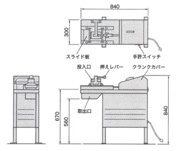 | ■特長 ●定寸に切った材料を投入して、押さえレバーを押さえるだけの簡単操作。 ●切りクズが少なく目減りのわずか5%程度で経済的。 ●ゴボウのほか、ニンジン、大根などにも。 ●小さいサイズは、2×2mm角棒、3×3mm角棒、3×4mm角棒。 ●市販カミソリ刃使用(交換時は刃を十分に洗浄、試し切りして使用。) ■寸法図 ![]() ■仕様