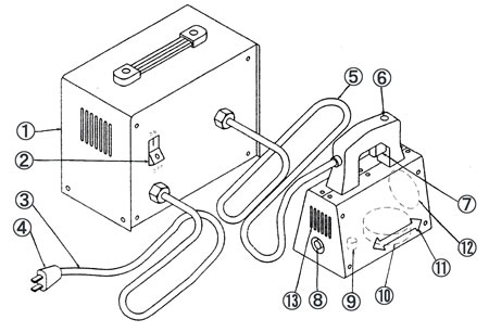 ■各部の名前![]() 電源部:@電源本体 A電源スイッチ B電源コード C差し込みプラグ D給電コード アプリケータ部:E通電・発振確認ランプ F一次スイッチ(トリガースイッチ) G通電タイマー H二次スイッチ(コイル側スイッチ) (高周波発生部) I加熱コイル J加熱部表示 K排熱口 L吸気口 ■仕様