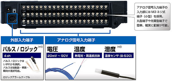 | ■特長 <USBメモリと内蔵フラッシュメモリで安心収録> ●全chマルチファンクション&絶縁入力 標準で20chのアナログ入力装備。しかもチャネル間の影響を受けない絶縁入力方式です。 煩わしい配線に気をつかう必要はありません。温度/電圧/湿度/パルス/ロジック入力に対応したマルチファンクション対応で、あらゆる用途でご使用いただけます。 ![]() (*1)パルス・ロジックはいずれか4ch。オプションのロジックアラームケーブル(M245-513G)が必要。 (*2)オプションの湿度センサ使用時、標準は1本のみ使用可能。 ●刄ー型 A/Dコンバータを搭載 耐ノイズ性を高めるため、刄ー型のA/Dコンバータを搭載し、高周波ノイズの除去効率を向上させました。これによりインバータ等からのノイズの影響を少なくしました。 ●最大200ch、パソコンとの接続なら500chまで拡張可能 端子台を20ch/ユニットに統一し、本体でのチャネル拡張は最大200chに対応。 しかも全チャネル絶縁入力&マルチファンクション入力。 また、PCを使用した計測では、複数の本体(最大10台)を接続することにより最大500chを1台として制御したり、個々に制御することが可能です。※M245L-820G拡張方法 ●各種フィルタを搭載 各chの移動平均フィルタとデジタルフィルタ(AC電源のノイズ除去)を搭載し、ノイズ等の影響を少なくします。 各chに搭載の移動平均フィルタ:2,5,10,20,40,Off デジタルフィルタ(AC電源のノイズ除去フィルタ) ただし、本フィルタが有効に機能するには、測定ch数と設定可能なサンプリング間隔に制限があります。