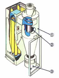 | ■特長 ●サイクロン効果により粗粉塵を捕集 ●サイクロン効果によりフィルターの目詰まりが少ない ●高性能サイクロンと余裕のフィルター面積を一体化 ●幅広い用途に使え、高濃度・大量粉塵も強力に収集 ■荒ゴミ処理もラクラク サイクロンにより捕集された粗ゴミも手を汚さずラクラク処理。 ![]() ■余裕のフィルタ面積 サイクロンの排圧を利用した内面濾過方式です。 朱子織コットンフィルターで微粉塵も効率良く捕集します。 ![]() ■各部名称