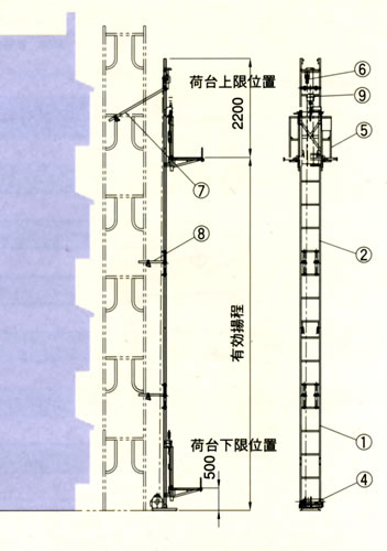| ■特長 ●中・高層用垂直型 仮設用リフトの決定版 ●荷台が旋回し、荷を安全に取込み可能 左旋回が標準です。(右旋回はご指定ください) ![]() ●荷台は落下防止機能付き ■標準組立図 ![]() ●構成部品