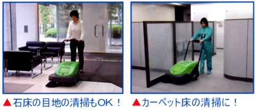 | ■特長 ●新型4種混毛8列ブラシで回収力アップ! 全自動ブラシ接地圧設定システム(セルフレベル機構)の採用により、 細かいダストから粗ゴミまで残さず回収します。 ●最高の作業効率 コードレスなので自由自在。快適に作業できます。 一人の作業者で最大2,500u/hの清掃が可能です。 ●長時間稼働 1回の充電で最大3時間の運転が可能。 広い現場でも安心してご使用いただけます。 ●簡単な操作 操作はタッチパネルを押すだけ。誰でも簡単に操作できます。 ●超静音仕様 運転音50dB(A)※を実現。 時間と場所を選びません。 ※騒音値:本体からの距離7m、地上高さ1mの地点で測定。 ●セルフレベル機構 床面の状況時応じてブラシが自動的に上下するセルフレベル機構と3種類の密植ブラシの採用で、 小型機でありながら大型機以上の能力を発揮します。 ![]() ●高性能ろ過 プレフィルターと大面積プリーツフィルターの採用で、排気もクリーンです。 ![]() ●集中ワンタッチパネル 操作はワンタッチ方式。 自動制御機能で、現場に適した清掃方法を選ぶことができます。 ![]() ●充電器内蔵 内蔵充電器の採用で充電場所を選びません。 ![]() ●簡単メンテナンス メインブラシやフィルターの交換、ハンドル高さ調整などが工具不要で行えます。 ![]() ■使用現場例 ![]() ■仕様