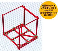 輸出梱包用軽量プラスチックパレットに対応し、幅広い用途に使用できます。 たわみやすい輸出梱包用軽量プラスチックパレットを、独特の「木桁」フレームで強力にサポートできるよう新設計。 移動は自由自在、収納・保管のスペースセービングに威力を発揮します。 |