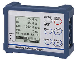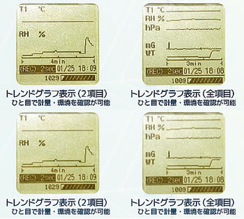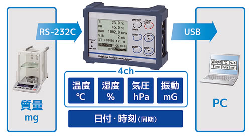 | ■特長 ●データ総記録容量:10,000セット ●記録間隔:1秒〜60分 ●測定機能:単独で4ch記録:計量値も入力可能 ●環境の変化をグラフで表示可能 ●天びん+計量環境ロガー+PCで リアルタイムデータ転送 ●PC接続時ドライバーソフト不要 ●省電力機能(電池動作時) ■使い方 ●天びんに接続(計量データと環境データの同時記録) 天びん・はかりと接続することで計量値と環境データを同時に記録出来ます。電源は天びんからとることができます。 ●環境モニタとして単体で使用 単体で温度・湿度・気圧・振動のデータを記録します。 電源は乾電池、PCなどからのUSB電源、ACアダプタでとることが出来ます。 ●パソコンに接続して使用 付属のUSB ケーブルでパソコンに接続し取得したデータを転送できます。電源はパソコンからとることが出来ます。 ●天びん・はかりとPCを中継 天びん・はかりと⇒計量環境ロガー⇒パソコンを繋ぐことで、計量値と環境データをリアルタイムに転送できます ![]() ■様々な表示方法 -表示させたい項目だけを表示- <環境データ表示画面例> ![]() ■仕様
