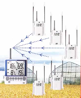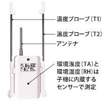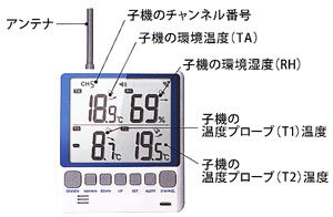 | ■親機(表示器)の特徴 ●温度、湿度の上限・下限アラーム設定が可能 ●赤色LEDランプとブザー音でアラームをお知らせ ●子機の温度、湿度を同時に表示 ●子機を最大5台まで増設(接続)が可能 ●温度や湿度の最高値、最低値のメモリ機能 ●温度や湿度のトレンドを矢印マークで表示 ●外部電源(ACアダプター)の使用が可能 ■子機(外部センサー)の特徴 ●環境の温度、湿度および、プローブ温度センサーで2ヶ所の温度が測定可能 ●液晶表示付き、温度や湿度を同時に表示 ●プローブ温度センサーのケーブルは着脱可能、ケーブル長約2.5m ●プローブ温度センサーは子機に固定可能。プローブハンドル部に吊り下げフック孔付き。 ■使用例 ●野菜・果物・畜産物・酒などの倉庫に 食品の保管・貯蔵庫や酒蔵、ワイン保管庫の温湿度測定に ●農業ハウスに 育苗など、ハウス内の温湿度や土壌中の温度(地温)測定に ■子機の増設ができます。 親機1台に子機を5台まで増設(接続)することができます。 親機のチャンネル切替ボタンを押すことで、5台までの子機を測定値を親機で切替表示することができます。 ![]() ■表示内容と名称 ![]() ![]() ■仕様