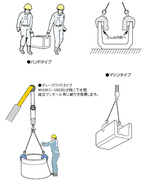 ●軽量U字溝吊りはハンドタイプ(M303KC-150S)、下水組立マンホール吊りはマシンタイプ(M303KC-1250DS)が最適。