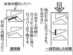 | ■オールロック機構 全ての引出しが同時にロックされ、大切な工具・部品を守ります。 ![]() ■ラッチ機構 取手内部のレバーを操作しないとラッチ(カギ型金具)が解除されず、引出しは出せません。 ![]() ■セーフティロック機構 一つの引出しを開けると安全システムが自動的に動いて、他の引出しは全てロックされます。 引出しが一段ずつしか開かない為、キャビネットを転倒事故から守ります。 ![]() ■引出し代・均等耐荷重 ![]() (mm)