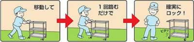 ■ロック使用例![]() ■フットブレーキ操作方法 ●ロック方法 ペダルを読込むことによりブレーキがかかります。 ![]() ●解除方法 ペダルを押し上げることによりブレーキが解除されます。 ※車輪を直接ボルトで押し込む為、確実にロックされます。 ![]() ■重量タイプ 棚板は内側へ二重曲げの構造を採用しているため非常に堅牢です。 ![]() ●使用時の安全性の向上 棚板と支柱の組立は、木づちで軽く叩くだけ。スピーディーに仕上がります。 ![]() ■ダブルテーパー加工 ●棚板の支柱と固定する部分に特殊な加工が施されており、棚板を逆さにするだけで皿型、フラット型と組替える事が出来ます。 ![]() ■支柱・ブッシュ 50mmピッチのミゾ付のため各棚板の間隔を自由に変えられ、段数増しも可能です。 ABS樹脂ブッシュ採用で棚板と支柱との密着強化を図っています。 ![]() ■タイプ