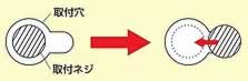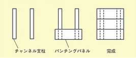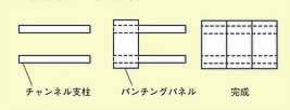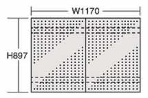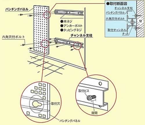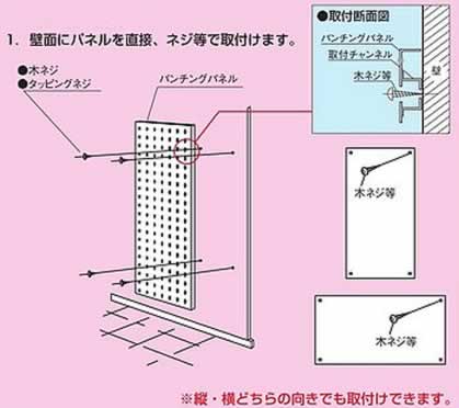 ■取付け使用方法 ●チャンネル支柱を使用する場合 ![]() ●横付け(3枚) ![]() ●縦付け(3枚) ![]() 1.チャンネル支柱に取付ビスを5mm程度隙間を空けてつけます。 2.パンチングパネル側に ![]() 上のイラストのように大きな穴の部分に取付ネジを通してから、小さい穴へとパンチングパネルをスライドさせて、あとは取付 ネジを締めます。 ■直付けの場合 ![]() ●取り付け方も簡単