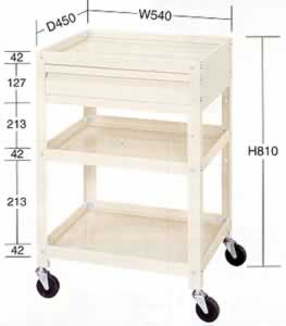 堅牢、安全、美観の三拍子が揃った新しいワゴンです。 人に優しい棚板形状です。 |
