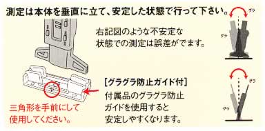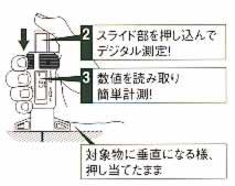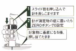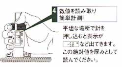 | ■特長 ●ソフトな状態でも測定可能な商品という事で商品名にしました。 ●ウレタン防水材の生乾き状態・硬化途中での厚み確認が出来ます。 ●弾性内外装タイル用接着剤やシール材の測定等にも大変便利です。 ■使用方法 ※あまり押さないで下さい。押し付けると測定の正確性を損なったり本品へ対象物が入り込む可能性があります。 ![]() ■仕様