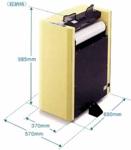 | ■包装機能ますます向上 ●高精度な均等フィルム搬送 新搭載のアシストモータとブレーキ制御により、ロールフィルムを高精度に搬送。 2本のロールフィルムは均等に消費されます。 ●最速72部/分の高速処理 新聞本紙だけでなく、スポーツ新聞なども同時にラッピングが可能。 最速72部/分※とスピーディです。 ※標準・半シールモード時。 ![]() ●通紙厚さモード切り替え機能 挿入する新聞のページ数に合わせて、最適な溶着時間や再搬送タイミングで包装します。 専用ボタンで設定もカンタンです。 ●シャッター圧切り替え機能 シャッター圧を4段階で切り替えられます。 新聞のページ数が少ない場合も、多い場合も、安定したラッピング処理を実現します。 ●フィルム溶着条件メモリ機能 2パターンの溶着条件がメモリ登録可能なので、使用するフィルムを変更した際などにも、操作パネルでカンタンに設定変更できます。 ●給紙アシストローラ 新聞のページ数が少ない場合でも、給紙アシストローラの補助でスムーズに挿入できます。 ■1,000mロール2本で約3,400部※をラッピング ロールフィルムは1,000mの長尺タイプを使用できるので、交換の手間が最小限に抑えられます。 また「厚もの」のラッピングに最適な幅520mmのフィルムにも対応可能です。 ※新聞32頁通紙時。 ■予熱時間約3分間のクイックスタート スイッチを入れてからヒーターの温度がフィルム溶着可能になるまでに要する時間は2分から3分15秒※ほど。 ムダな待ち時間を削減します。※使用環境により異なります。 ■2段階の省エネモードが環境保全と経費削減を推進 作業が可能な状態で30分以上動作しない場合、ヒーターの温度を下げて待機します。 また、2時間以上放置した場合は、ヒーターの電源をOFFにしてカウンタ上に表示。 どちらの省エネモードも、強制排紙/リセットボタンを押すだけで復帰します。 ■高速処理に対応する大容量の格納式紙受台 140mm※積載の格納式紙受台を標準装備して、キャビネットも不要です。 ※新聞後端の高さです。 ![]() ■用途に合わせて選べる3種の包装モード ●半シールモード 空気穴を一部分残して溶着するので、空気抜きができ、重ねても厚みを最小限に抑えられます。 ●全シールモード 完全密封されますので、豪雨時や水のたまった新聞受けやポストでも新聞が濡れません。 ●定位置カットモード フィルムに印刷された広告などがズレないように、常に一定の位置でカットします。 ■使いやすさを追求したシンプルな操作パネル。 ![]() ■寸法図 ![]() ■仕様