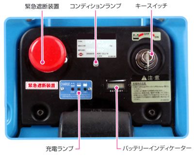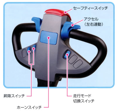 ■特長![]() ●業界初!AC走行モーター採用! 人に、環境にやさしいカーボンレスのモーター採用。 ●シールドバッテリー採用! バッテリーの管理が容易なメンテナンスフリーのシールドバッテリーです。 ●環境にやさしい! エコノミーモードにより消費電力を抑えることができます。 ●操作性の向上! 走行ハンドルの新デザインと集中パネルスイッチにより操作性と安全性がさらに向上! ●コンパクト設計により、旋回半径は、トップクラスの1300mmを実現。 小回りが効くので狭いスペースでの作業性は抜群です。 ![]() ■集中パネル ボタンやスイッチを集約することにより操作も確認もよりスムーズに。 ![]() ■走行ハンドル 新デザインにより、角スイッチを大きくするなど操作性・安全性・耐久性がさらに向上。 ![]() ●セイフティースタート 誤操作、御発進を回避するためにハンドルを倒さないと動作しない安全機構。 ![]() ■充電コード・充電プラグ差込口