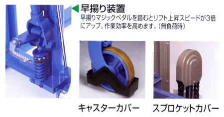 | ■特長 ●早揚り装置付(M37NL-H350-15Kは除く) ●全機種キャスターカバーを標準装備。 ●強力な足踏みパーキングブレーキ付。 ●安全性重視の自動積荷チェックバルブ装置内蔵。 ●大型透明ガードパネルを採用し、より安全性を確保。さらに、PET材を使用し、環境にも配慮しました。 ●スプロケットカバーに軽くてクリーンな樹脂製カバーを採用。 ●環境に配慮した無鉛塗装。 ●小型、軽量だから小回り抜群。 ![]() ■タイプ