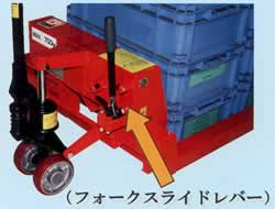 簡単なレバー操作でフォーク巾が550m/m~850m/mの範囲でスライドします。(但し、無負荷時) | コンテナ用リフトパレットリフター 品番 M37PHL-7F-80K |