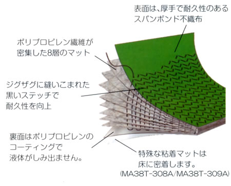 | ■特長 ●油、冷却水、溶剤、水などを吸収します。 ●マット表面はスパンボンド不織布をポリエステルのステッチで縫いこんでおり、耐摩耗性、耐久性にすぐれています。 ●表面の不織布に、厚手で丈夫な素材を採用し、耐摩耗性がさらに向上しました。 ●吸収した液体は床面にしみ出ません。床面をドライでクリーンに維持します。 ●はさみやカッターで必要なサイズにカットすることができます。 ●安全の意識を高めるグリーンのマットです。 ●防炎適合品。 ●マット表面が特殊な粘着素材になっており、マットの上を歩いたり、カートが通過しても、マットがずれたり、折れ曲がりがなく、スリップを防止します。 もちろん、吸収した液体は床面に通しません。 (M38T-308A、M38T-309A) ![]() ■製品詳細 ![]() ■仕様