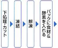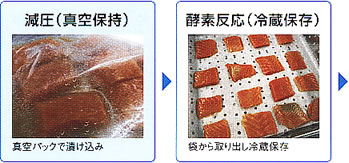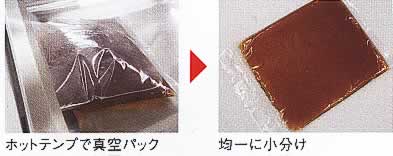 | ■特長 ●温かい料理やソースをそのままパック。 ●凍結含浸法にも対応 ●真空包装がスピーディー ●食材の保存から漬け込み、真空調理まで幅広く対応 ●温かい食材を2袋同時にパックできる。 ●70~90℃の食材が素早くパックできます。 ●庫内が大きく、小さな袋を同時に複数枚パックすることが可能です。 ●固体、液体両方ともパックできますので、食材を選びません。 ※角のある食材は除く ●パック前冷却時の二次汚染のリスクが無くなり、より衛生的な管理が可能です。 ●油分の多い食材も均一にパック可能ですので、用途の幅が広がります。 ●食材に合わせて色々な設定ができますので、気泡残りが無くしっかりパックができます。 ●温かい食材はもちろん、常温や冷たい食材の真空包装もスピーディー。 (70~90℃と20℃以下の液体は別プログラムで真空パック) ●真空吸引、保持時間などがニーズに合わせてプログラムできますので、 今話題の凍結含浸法の製造などもワンタッチ操作で行えます。 ■ホットテンプ機能 温かい料理やソースをそのままパック 70℃~90℃ ●オリジナルの膨張感知で温かい食材をきちんとパックします。 ●吹きこぼれやすい粘性のある液体も、レバープレートが運転を制御し、吹きこぼれを防止します。(液体・粘性モード) ![]() ■真空調理や加熱調理後の料理やソースのパックに ![]() ■ラーメンスープの場合 今までは・・・ ![]() ●本機なら ![]() ![]() ■凍結含浸法対応(真空保持機能を搭載) ●凍結含浸法とは、酵素を用いて食材を形のまま柔らかくする手法で、医療福祉現場で注目されている広島県の特許技術です。 ●酵素(専用調味料「とろん」を食材の内部まで浸透させるために、真空保持を行う必要があります。) ※真空保持時間は食材や仕上がりに合わせて調整 ■一般的な凍結含浸法の工程 ※魚の場合 ●プログラム11またはガンシンモードにて、真空度が最高値(99.8%)に達したのち、真空度保持が1~30分間設定可能 ![]() ![]() ![]() ■その他 作業・利便性もアップ ●固体、液体、温度など食材に合わせてきめ細やかな設定ができます。 ●常温や冷たい食材の真空包装もスピーディー ●フラットな庫内で、清掃が楽に行えます。 ●庫内が大きく、小さな袋を同時に複数枚パックできます。 ●置き場所、能力に合わせて2タイプご用意 ※食材の形状、量に見合った袋のサイズをご検討下さい。(目安として6~8割) ■多彩なモードを搭載 これ1台で様々な用途に使えます。