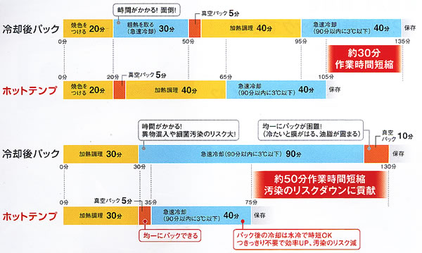 ●効率化 時間との手間のかかるパック前の冷却工程が省け、作業効率が大幅にアップ。 ●衛生的 冷却時の二次汚染リスクもなく、より衛生的な管理が可能に ●高品質 冷却すると膜がはる、油脂が固まるなどパックが難しかった食材も、ロスなく均一にパックできます。 例)シチューソース、ラーメンスープなど |